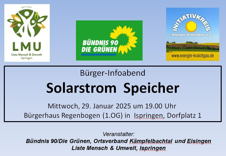 Die Veranstaltung ist öffentlich und wird gemeinsam vom Grünen Ortsverband und der LMU Ispringen organisiert. Wie schon bei unserer Veranstaltung zu Balkonsolar wird wieder der Initiativkreis Energie Kraichgau e. V. die Veranstaltung durchführen. Wir freuen uns sehr, dass als Referent dieses Mal Klaus Schestag zu uns kommt, der schon viel Erfahrung in diesem Bereich hat und bestimmt reichliche und aktuelle Informationen für euch parat hält. Natürlich könnt ihr auch eigene Fragen stellen. Weitere Informationen zum Inhalt der Veranstaltung findet ihr in der angehängten PDF-Datei.