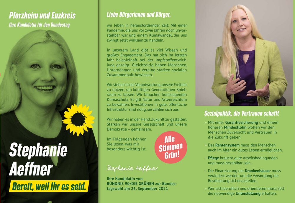 Bereits seit August wird der Wahlkampfflyer unserer Bundestagskandidatin Stephanie Aeffner in Pforzheim und dem Enzkreis verteilt. Vielen Dank an alle freiwilligen Helfer. Der Flyer lässt sich aber auch hier digital als PDF lesen. Für mehr Informationen zu Stephanie besuche ihre Website!
