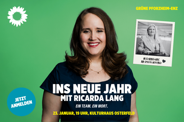 Der Kreisverband von BÜNDNIS 90/DIE GRÜNEN Pforzheim und Enzkreis lädt herzlich ein zum Neujahrsempfang 2025 am 23. Januar um 19 Uhr im Singsaal des Kulturhauses Osterfeld (Osterfeldstraße 12, 75172 Pforzheim).
