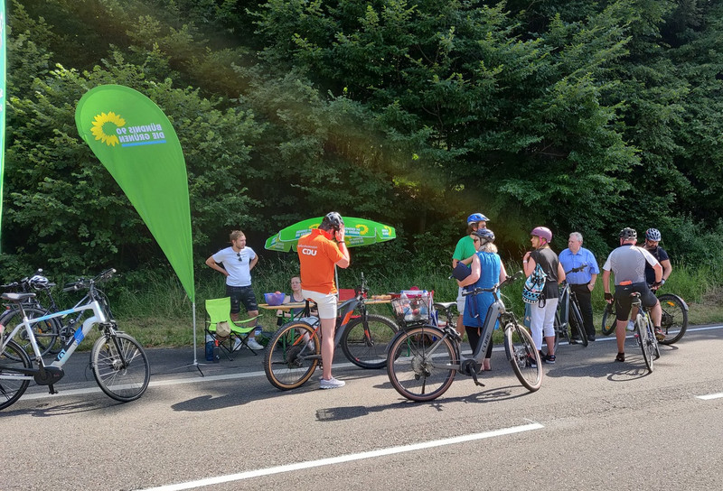 Vereine und Organisationen präsentierten sich entlang des Weges. So auch der Ortsverband Pforzheim, der die Radler:innen am Würmblick mit Kuchen und Äpfeln versorgte. Hierbei gab es gute Gelegenheiten ins Gespräch zu kommen. Viele wünschten sich eine bessere Infrastruktur für den Verkehr jenseits des Autos. Dafür setzen wir uns ein!
