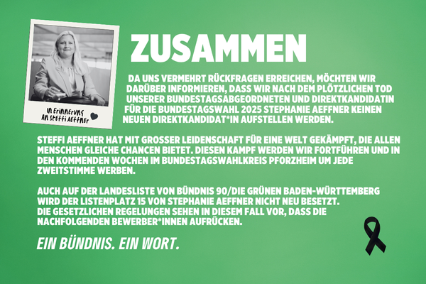 Steffi Aeffner hat mit großer Leidenschaft für eine Welt gekämpft, die allen Menschen gleiche Chancen bietet. Diesen Kampf werden wir fortführen und in den kommenden Wochen im Bundestagswahlkreis Pforzheim um jede Zweitstimme werben.