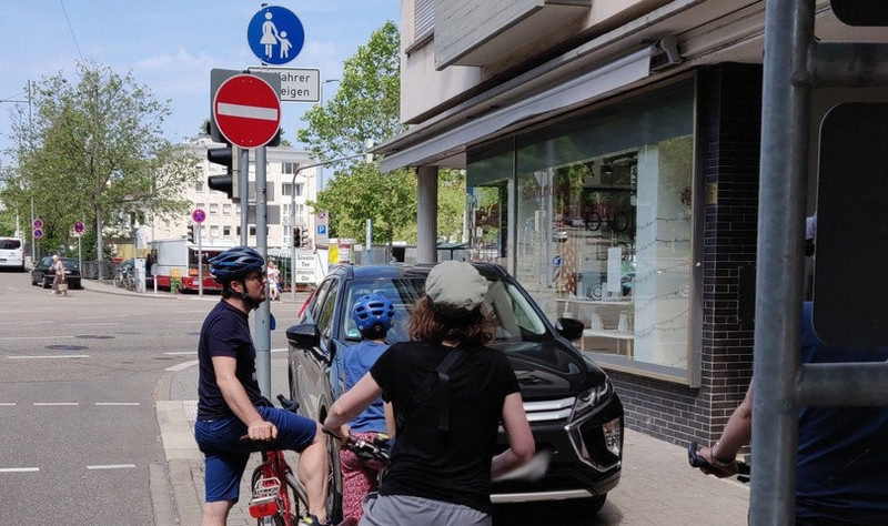 An manchen Stellen macht Radfahren in Pforzheim schon richtig Spaß wie auf den breiten Radspuren auf der Östlichen KF, die gemeinsam mit Busen genutzt werden. An anderen Stellen kann man verzweifeln wie am westlichen Ende der Weiherstraße, wo der Radweg auf dem Gehweg endet und dann noch zugeparkt ist (s. 2. Bild). Diese Eindrücke sammelten Mitglieder und Interessierte auf der Radtour des Ortsverbandes Pforzheim bei ihrer Radtour am Samstag.