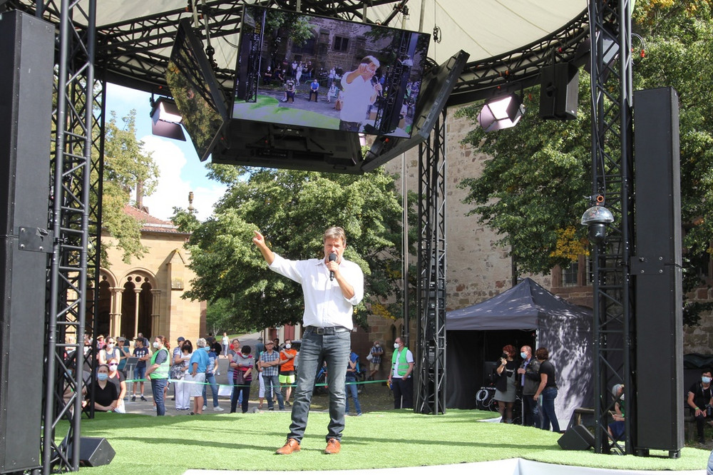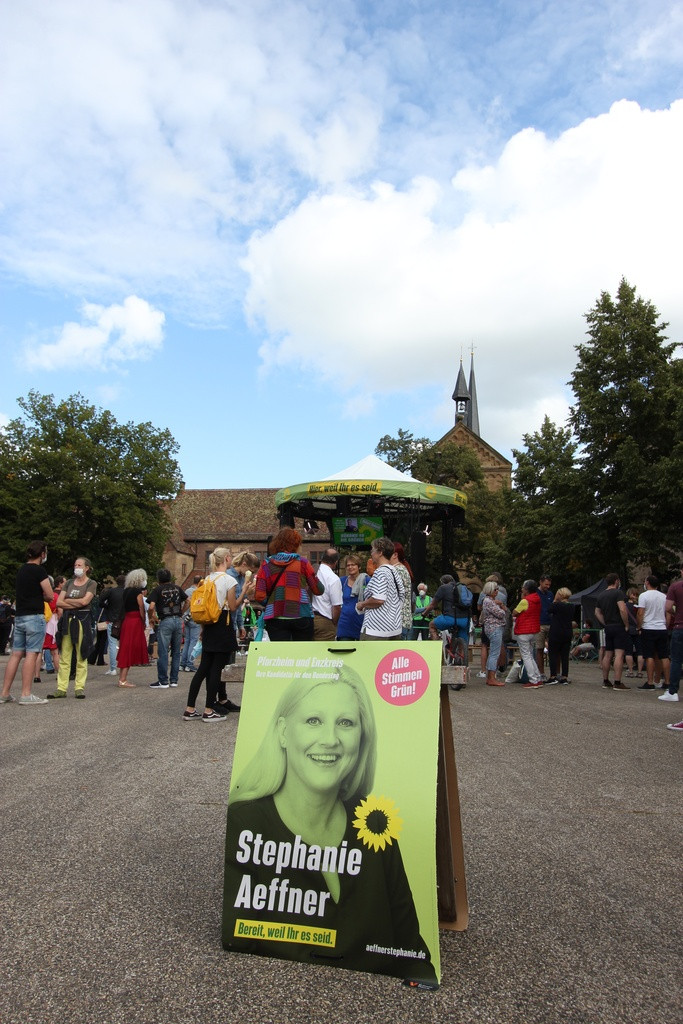 Zum Start der Veranstaltung um 14:30 begrüßte die Moderatorin Stefanie Wally die Anwesenden. Als Erste sprach Stephanie Aeffner mit einer leidenschaftlichen Rede. Der Leitanker ihrer Ausführung war der Zusammenhalt und die Begegnung in unserer Gesellschaft. Ein wesentliches Beispiel für sie war, dass jede Dorfgemeinschaft einen Treffpunkt braucht, an dem man in Kontakt kommt und ohne den das soziale Leben abnimmt. Weitere Themen waren die integrative Arbeit, soziale Gerechtigkeit und Wohnungsnot sowie die Klimakatastrophe. Ihr folgte Robert Habeck mit seinem Beitrag. Der Kern seiner Rede war ebenfalls die Klimakrise und im Besonderen die Tatsache, dass die Freiheit des Einzelnen ein entschiedenes Handeln gegen die Erwärmung heute nötig macht, damit diese Freiheit erhalten bleibt. Er betonte besonders, dass Staat und Regeln nicht im Widerspruch zu gelebter Freiheit stehen, sonderen dies auch erst möglich machen. Antworten auf die genannten Probleme müssen gefunden werden, damit aus Antwortlosigkeit keine Verantwortungslosigkeit werde. Zum Abschluss der Veranstaltung konnten die Zuhörer*Innen Fragen stellen, wovon auch reichlich Gebrauch gemacht wurde.