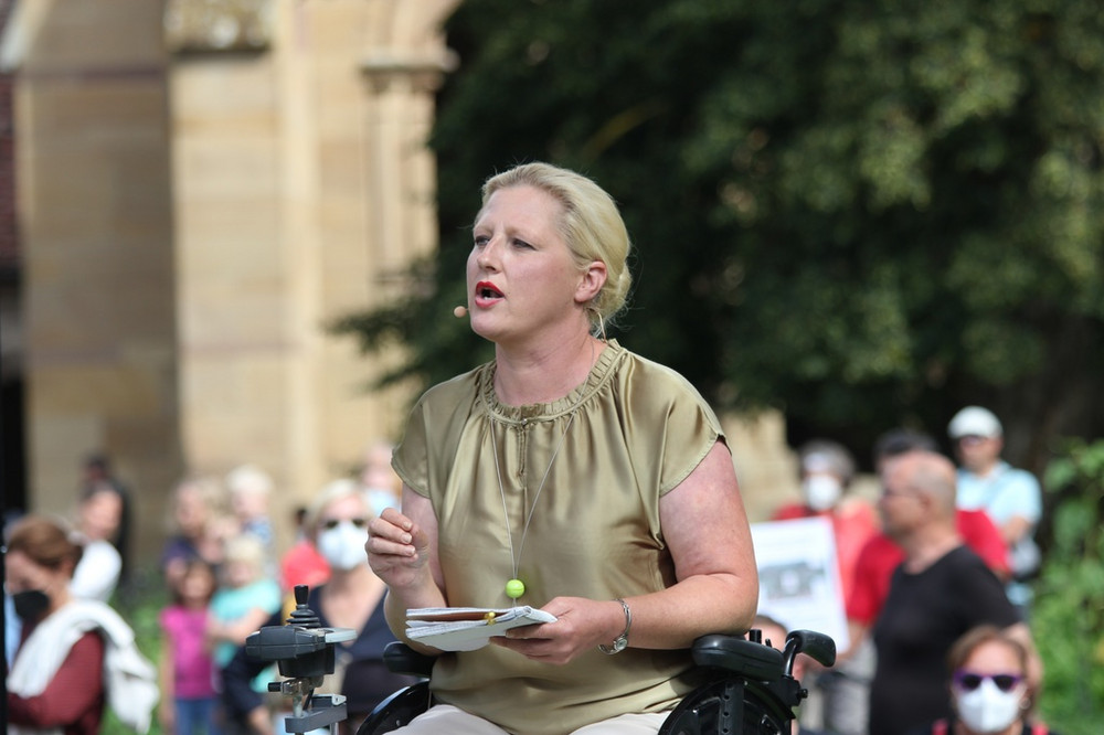 Ebenfalls zur Veranstaltung angereist waren ca. 50 "Querdenker", Rechtsradikale und Reichbürger, welche die Veranstaltung lautstark gestört haben. Dabei ließen sie sich nicht auf die Dialogangebote von Stephanie und Robert ein, sondern versuchten, die Veranstaltungsteilnehmer*Innen an der Ausübung ihrer Versammlungsfreiheit zu hindern. Ein Vordringen der "Querdenker" zur Bühne konnte Dank der spontanen Bildung einer Menschenkette verhindert werden. Über dieses Zeichen der gelebten Demokratie freuen wir uns. Trotzdem machte das aggressive Auftreten der Coronaleugner ein zwischenzeitliches Eingreifen der Polizei notwendig. Wir bedanken uns bei den Beamten für ihren Einsatz für die Veranstaltung.