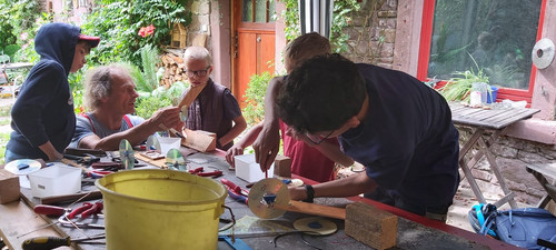 Alte CDs, Fahrradspeichen, Speichennippel, Holzbrett, Lüsterklemmen, Elektrodraht und eine Mausefalle sind die Zutaten zu unserem Ferienspieletag. Ständerbohrmaschinen, Handsägen, Hammer, Schraubenzieher, diverse Zangen, Geodreieck und Bleistift sind die Werkzeuge dafür. Es gibt eine mühselig erarbeitete Bauanleitung, die aber niemand liest oder versteht. 16 Kinder haben dann nach Muster losgelegt, 5 Betreuer haben versucht, die Richtung vorzugeben. Wir haben von 10 bis 16 Uhr mit einer Mittagspause durchgearbeitet, bei 3 Kindern gab es eine Verlängerung. Aber dann hatten alle Kinder ein funktionierendes Auto mit Mausefallenantrieb. Gut, manche Räder eiern und es gibt kreative Auslegungen der Vorgabe, aber alle Autos fahren. Die nächste Generation Handwerker*innen und Ingenieur*innen wächst heran.